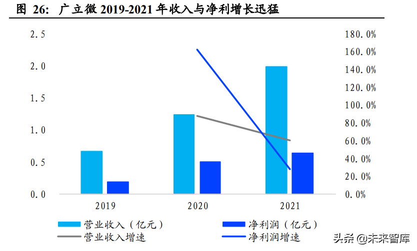 公司营收与净利保持高速增长态势。2019-2021年,公司分别实现营业 收入 0.66 亿元、1.24 亿元和 1.98 亿元,CAGR 达 73.07%,增长迅猛。 公司营收的高速增长受益于多年来积累的技术优势与产品,以及与主要 集成电路厂商合作关系的不断深化。同时期公司净利润分别为 0.19 亿元、 0.5 亿元和 0.64 亿元,实现 83.18%的 CAGR,与收入保持同步增长态势。