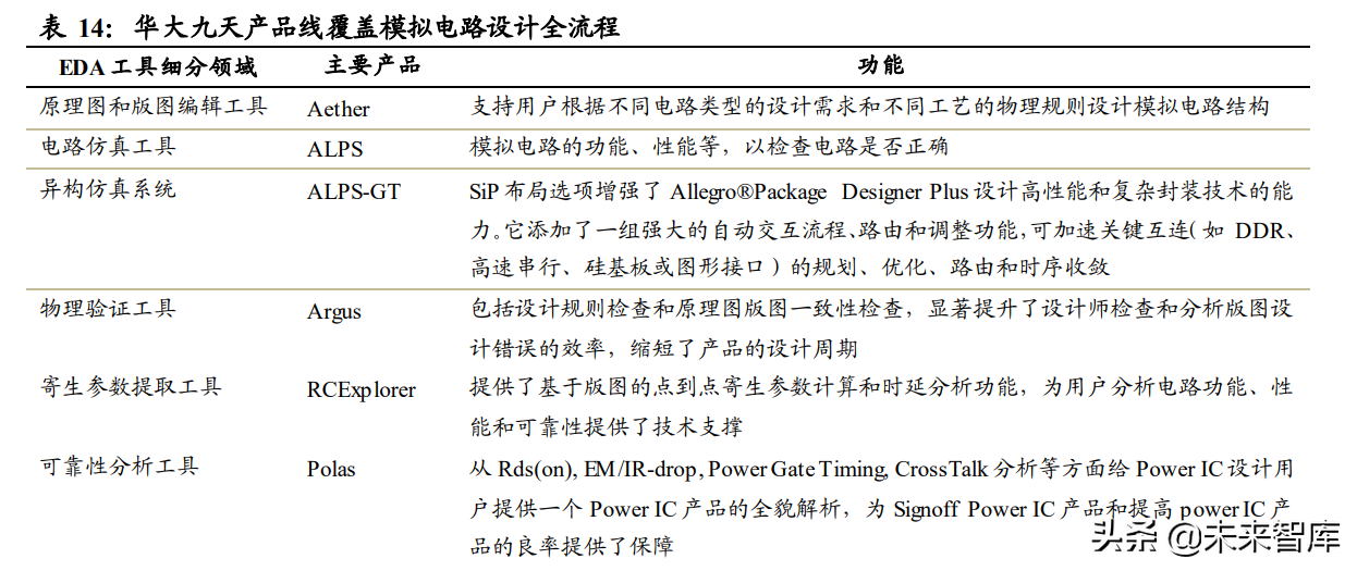 打破海外企业垄断,国内唯一模拟电路设计全流程供应商。 公司的模拟电路 EDA 工 具能够为下游 IC 行业客户提供版图设计、电路仿真、物理验证、参数提取和可靠性分析 在内的一站式完整解决方案。在原理图编辑阶段,公司具有 Aether 设计软件,其可以为 设计师高效的设计环境;在电路仿真阶段,公司具有 ALPS 工具和 ALPS-GT 系统,该 套系统突破了电路仿真的性能和容量瓶颈;在物理验证阶段,公司具有 Argus 工具,用 来检查版图与制造加工之间的适配性,能有效降低设计成本和减少设计失败的风险;提 取寄生参数阶段,公司则拥有 RCExplorer 工具,该工具可以根据工艺参数对版图电元 件进行数据计算。2020 年,公司发布了新一代模拟电路设计全流程设计工具,在提升各 方面性能的同时,也增加了对于新工艺的适配。