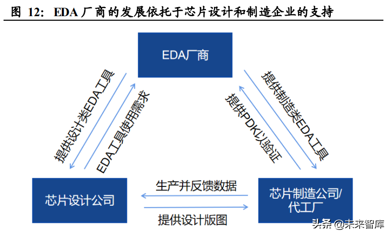 EDA 厂商与芯片设计和制造企业间的生态关系也是形成当今竞争格局 的原因之一。在 EDA产业生态圈中,EDA厂商分别向芯片设计公司和 制造公司提供设计类 EDA软件和制造类 EDA软件。芯片设计企业从EDA厂商购买 EDA工具,向制造企业提供设计版图。芯片制造企业向 EDA厂商输送 PDK,负责生产芯片并向设计企业提供反馈数据。总的 来说,EDA工具的技术开发和商业销售依托于制造、设计、EDA行业 三方所形成的生态圈,需要产业链上下游的全力支持。PDK对于 EDA 工具的研发是至关重要的,得不到晶圆厂 PDK的 EDA公司很难经营下 去,因此与晶圆厂的良好关系有利于 EDA厂商从竞争者中脱颖而出, 这在一定程度上促成了 EDA市场高度集中的格局。此外,领先的 EDA 厂商与领先的集成电路制造和设计企业具备长期合作基础,其 EDA工 具工艺库信息完善,能够随先进工艺演进不断迭代。然而,市场尾部 EDA 厂商难以获得生产线的最新工艺数据参数,无法在与工艺紧密相关的工 具领域进行技术布局,束缚了其业务的发展与完善,这进一步拉开了 EDA企业间的差距,形成了高度集中的市场格局。
