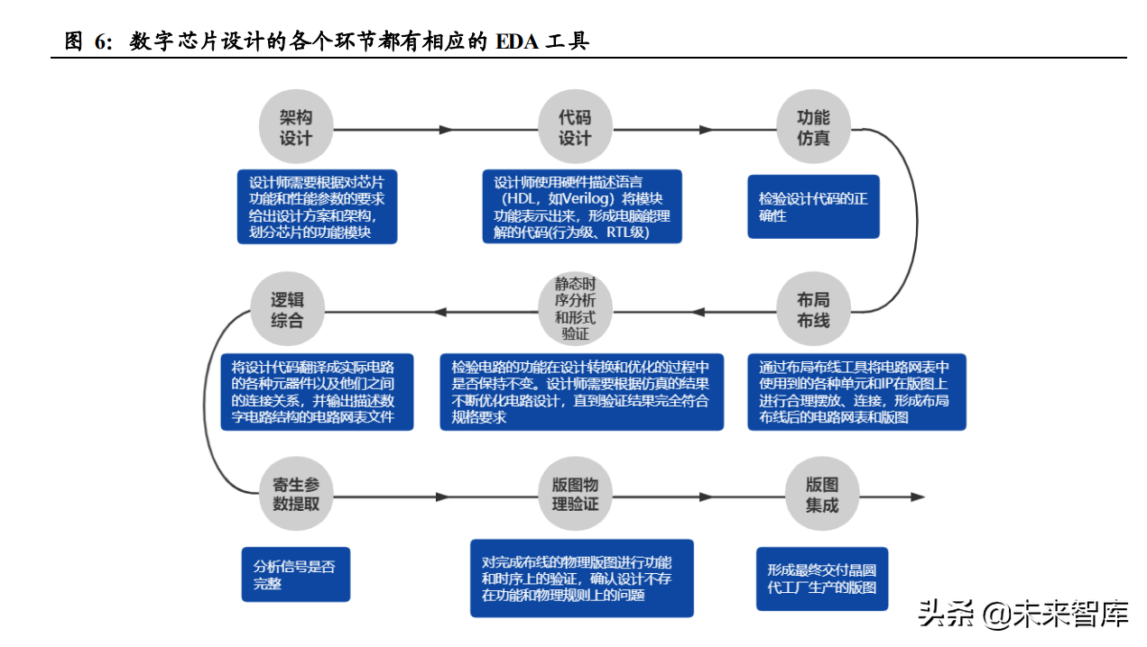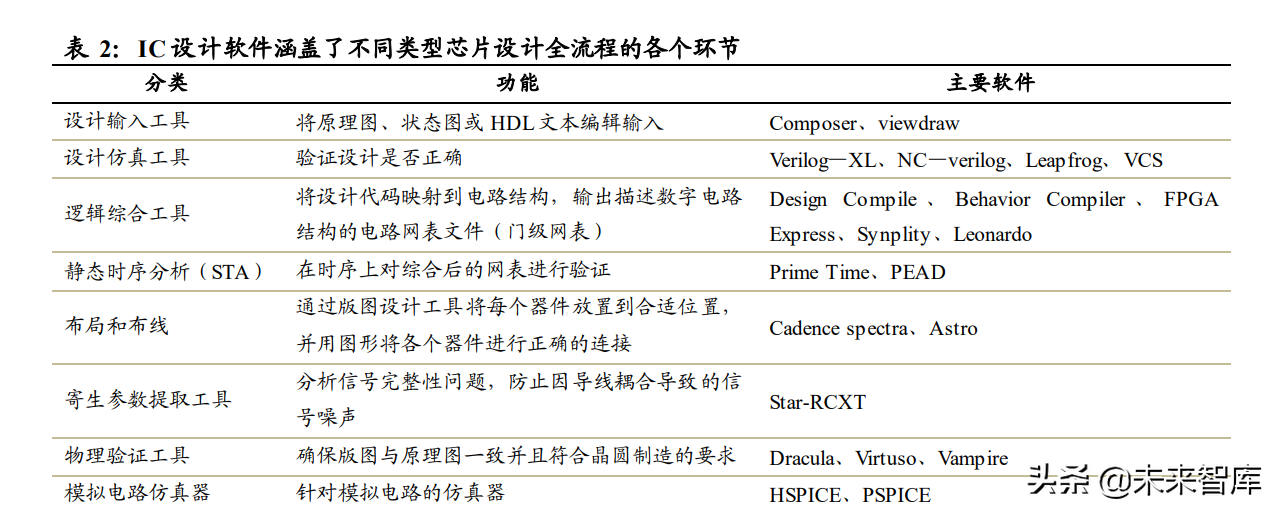 应用角度:EDA 工具广泛应用于多个设计场景,贯穿芯片设计各个环节。 EDA 工具 种类繁多,广泛应用于数字设计、模拟设计、晶圆制造、封装、系统五大类场景。以 EDA 工具的主要应用场景数字设计为例,其前后端设计的多个环节均需要依赖 EDA 工具实 现,前端设计:1)HDL 编码:将模块功能以代码(硬件描述语言)来描述实现。2)仿 真验证:检验编码设计的正确性。3)逻辑综合:把设计实现的 HDL 代码翻译成门级网 表。4)静态时序分析(SAT),在时序上对电路进行验证,检查电路是否存在建立时间 和保持时间的违例。5)形式验证:从功能上对综合后的网表进行验证。后端设计:1)可 测性设计:在设计的时候就考虑芯片自带的测试电路。2)布局规划:放置芯片的宏单元 模块,在总体上确定各种功能电路的摆放位置。3)时钟树综合:时钟的布线,时钟信号 在数字芯片起全局指挥作用,对称式地连到各个寄存器单元时延迟差异最小。4)布线: 各个标准单元之间的走线。