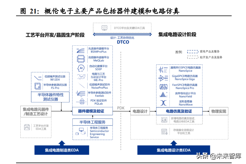 1)制造类 EDA 工具。公司的制造类 EDA工具主要为器件建模及验证 EDA工具,用于快速准确地建立半导体器件模型,是集成电路制造领域 的核心关键工具之一。公司器件建模及验证 EDA工具主要包括先进器 件建模平台(BSIMProPlus)、跨平台器件建模软件(MeQLab)、集成电 路工艺与设计验证评估平台(ME-Pro)、先进 PDK验证软件(PQLab) 等。该类 EDA工具能够用于建立晶体管、电阻、电容、电感等半导体 器件的基带和射频模型,能够支持业界绝大多数标准模型和宏模型、 Verilog-A等定制化模型。公司器件建模及验证 EDA工具主要功能包括 器件模型的自动建模和优化、模型质量检测和验证、不同工艺平台模型 的评估比较等,能够满足目前各种先进和成熟工艺节点的半导体器件建 模需求。