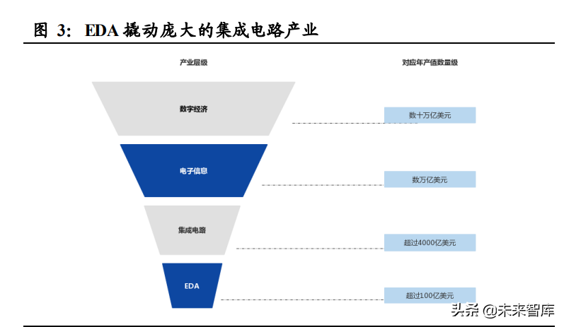 EDA 杠杆效应显著,是数千亿美元规模的集成电路行业的重要支撑。根 据 SEMI 的数据,2020 年 EDA行业的全球市场规模超过 100 亿美元, 却撬动着年产值超过 4000 亿美元的集成电路行业。相较于制造芯片的设 备、生产线、原材料等动辄数亿美元的花销,EDA工具在集成电路企业 的采购总额中占比较小。但是,作为贯穿集成电路设计、制造、封装、 测试等产业链各个环节的基础工具,EDA是集成电路产业的咽喉,将直 接影响产品的性能和量产率。一旦 EDA 这一产业链基础出现问题,整 个集成电路产业乃至上层运行的数字经济产业都会受到重大影响。