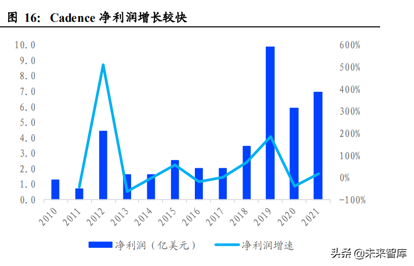 4)PCB 设计。公司使用仿真驱动的解决方案,简化从概念到制造的复 杂设计,以提供设计周期更短、更可预测的 PCB设计解决方案。此外, 公司产品及方案允许协同设计,用户可在单一设计或复杂的多板 PCB系 统上跨墙、跨设计域进行协作。公司 PCB设计产品包括前端原理图捕获、 后端板布局和布线、库与设计数据流程管理、模拟/混合信号仿真、SI/PI 分析、SI/PI 分析点工具等。 净利润增速强于营收增速。2021 年,铿腾电子实现营业收入 29.88亿美 元,同比增长 11.38%,实现净利润 6.96 亿美元,较 2020 年增长 17.83%。 公司2010-2021年营业收入和净利润的CAGR分别为 11.13%和16.76%, 相较于营业收入增长,净利润增速较快。