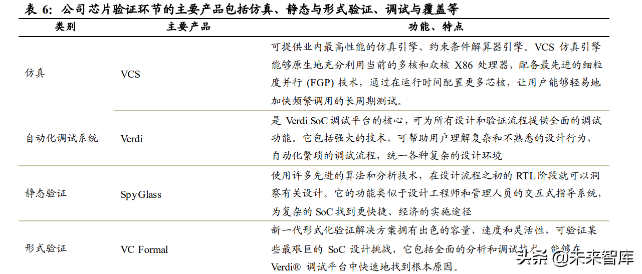 验证工具:最快的引擎和最智能的全面验证管理工具。 公司的功能验证产品主要用 于在定制和模拟设计之后验证设计的电路或者产品能否按预期运行,进而保证电路制造 的可行性,大大降低失误的成本。公司的验证工具可以充分提升设计质量,满足各种应 用和验证要求,主要包括形式与静态验证、仿真、模拟、计划与管理、验证 IP、Debug 分析、软件驱动验证、系统级 IP 验证等功能。