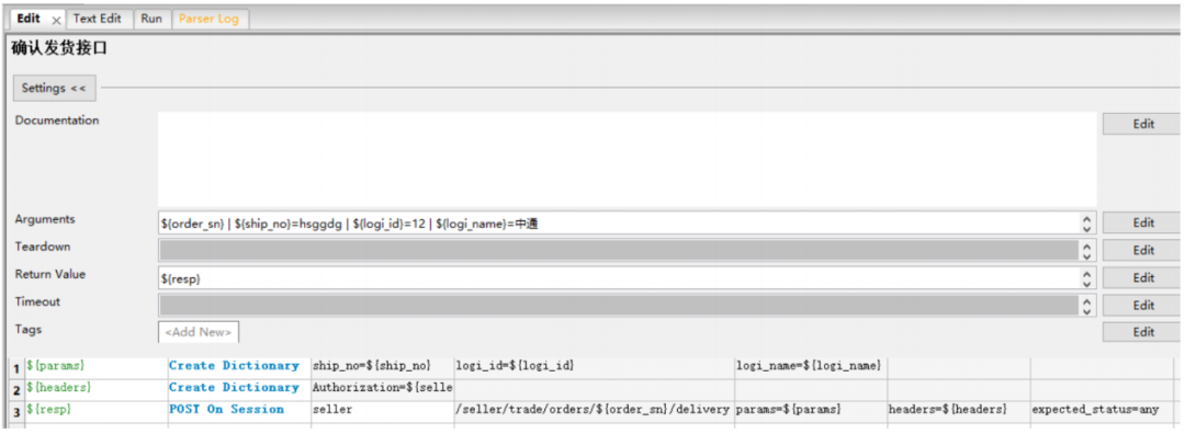 在[接口默认参数]目录中创建一个 创建商品.json文件,内容写所有参数的默认值 关键字入参的含义: ${new_params}给了一个默认值,表示可以不传,不传时接口使用默认参数发起请求,如果用户需要针对默认json参数里的某些字段进行修改,${new_params}的传递规则是字符串形式的json格式字符串,key必须是jsonpath表达式,value是要替换的新值例如 脚本解释 第一行:读取默认参数第二行:判断有${new_params}不等于default,说明用户传了其他数据第三行:判断有${new_params}不等于default,调用[替换json数据]关键字替换并返回3、确认发货接口