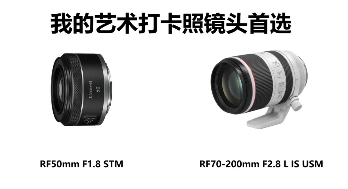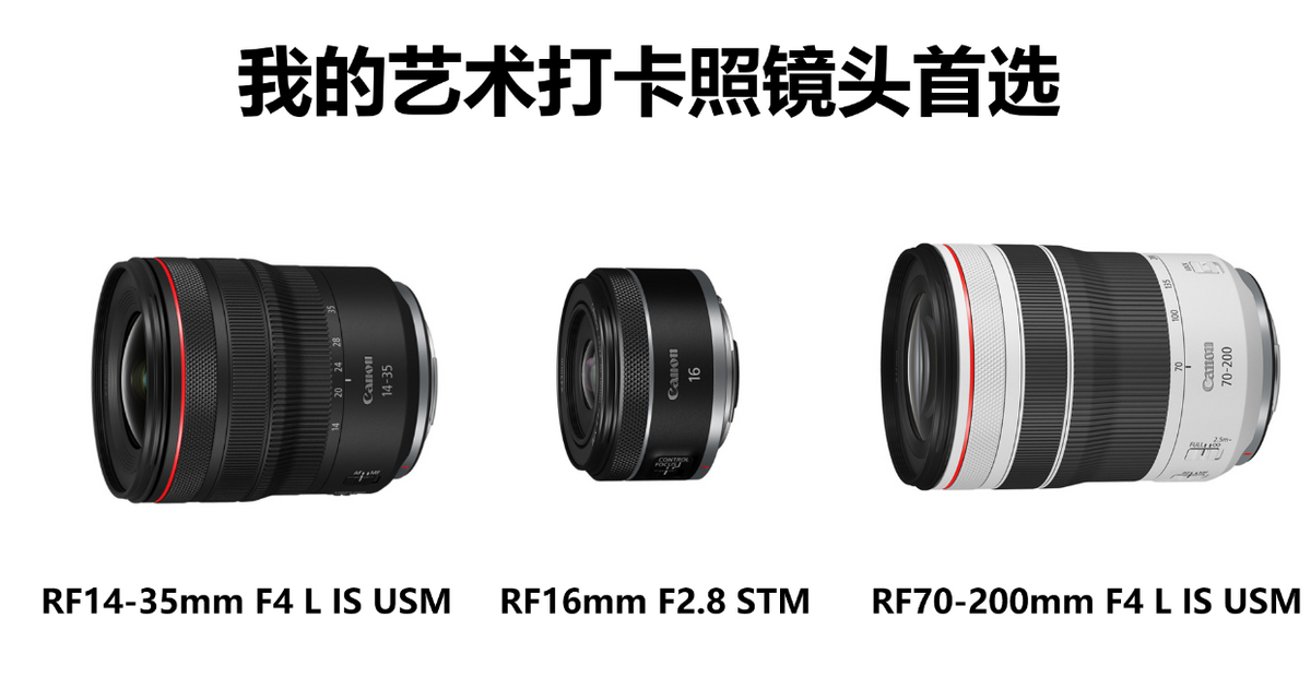 私徒熠:对于拍摄艺术打卡照来说,RF50mm F1.8 STM是一支非常小巧的大光圈镜头。对于随身携带来说非常方便,安装在EOS R5/R6机身后也可以轻松手持。RF70-200mm F2.8 L IS USM大三元,这支镜头在远距离的构图有非常出色的表现,拍摄人像也是非常好的选择,是一颗多功能的镜头。RF14-35mm F4 L IS USM无论在视角、画质和体积上都有了诸多突破,更广一步的14mm视野可以轻松的带来夸张的视觉冲击力,这也是超广镜头最吸引人的亮点,恒定F4的光圈以及拥有着不俗的IS防抖实力。
