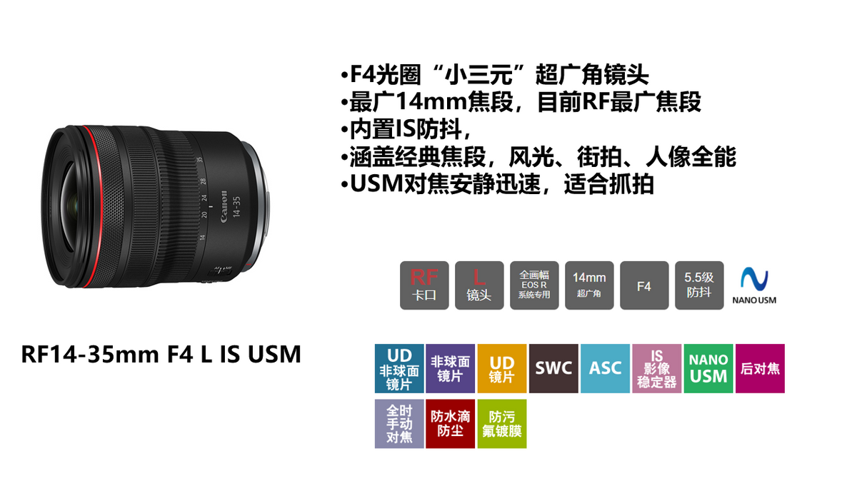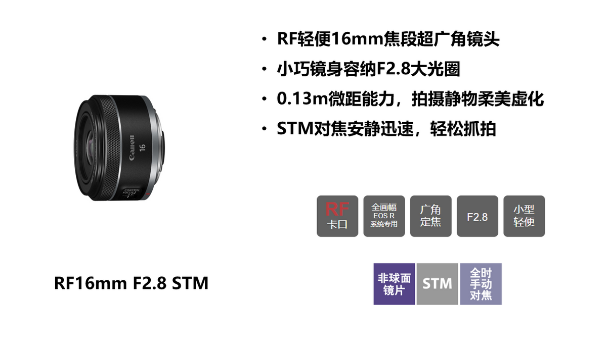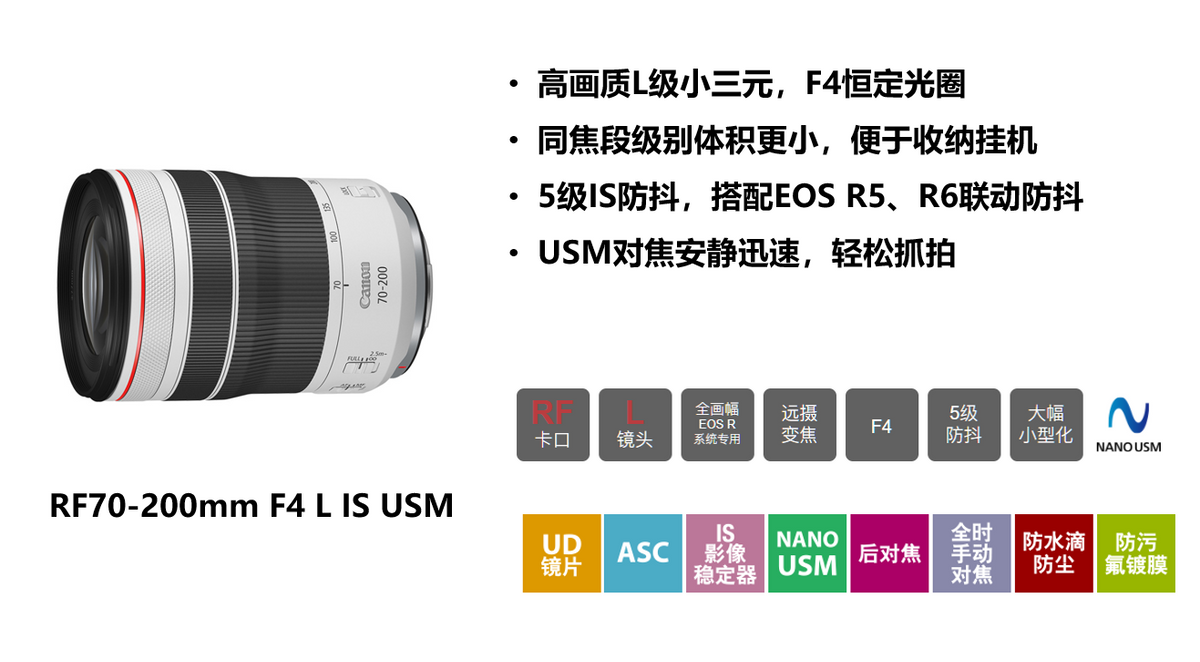 还有RF16mm F2.8 STM同样非常优秀,RF16mm F2.8 STM镜头重量仅有165克,滤镜口径仅43mm。无论是16mm的宽广焦距,还是F2.8的大光圈加持,和不俗的性价比,让这支小巧平凡的镜头多了不少值得把玩品味的方面。首先是16mm视角,大大超越人眼常规的视觉习惯,因而可以带来更“吸睛”的画面感。对于日常随手拍而言,可以轻松在咖啡厅、餐厅等室内,商业区建筑群,公园树林等场景带来视觉冲击力。RF70-200mm F4 L IS USM体积也非常小巧,一听可乐的体积,便于收纳挂机。