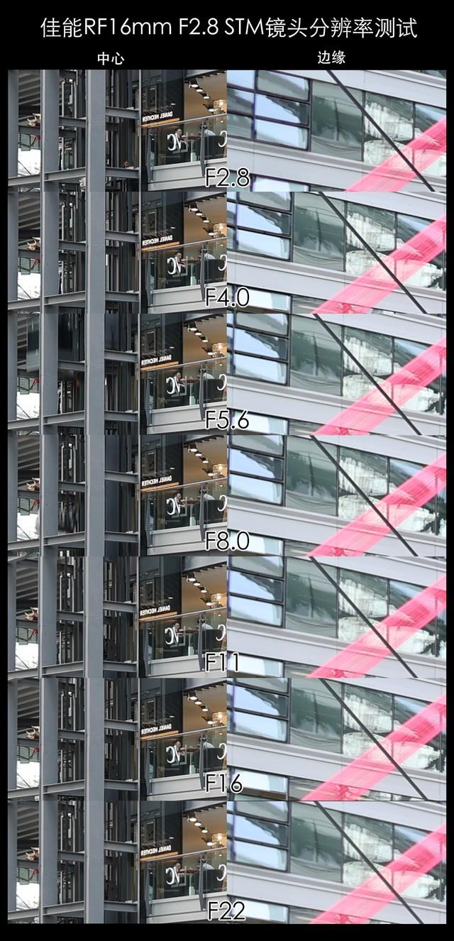 佳能RF16mm F2.8 STM这样一直身材小巧的超广角定焦镜头,画质表现如何呢?这也是很多用户最关注的问题。在测试这支镜头时,我们搭配佳能EOS R6机身进行画质测试,拍摄时将相机光圈设定在ISO100,并对镜头各档光圈逐级拍摄,借助画面中心和边缘,来一窥RF16mm F2.8 STM镜头的画质表现。