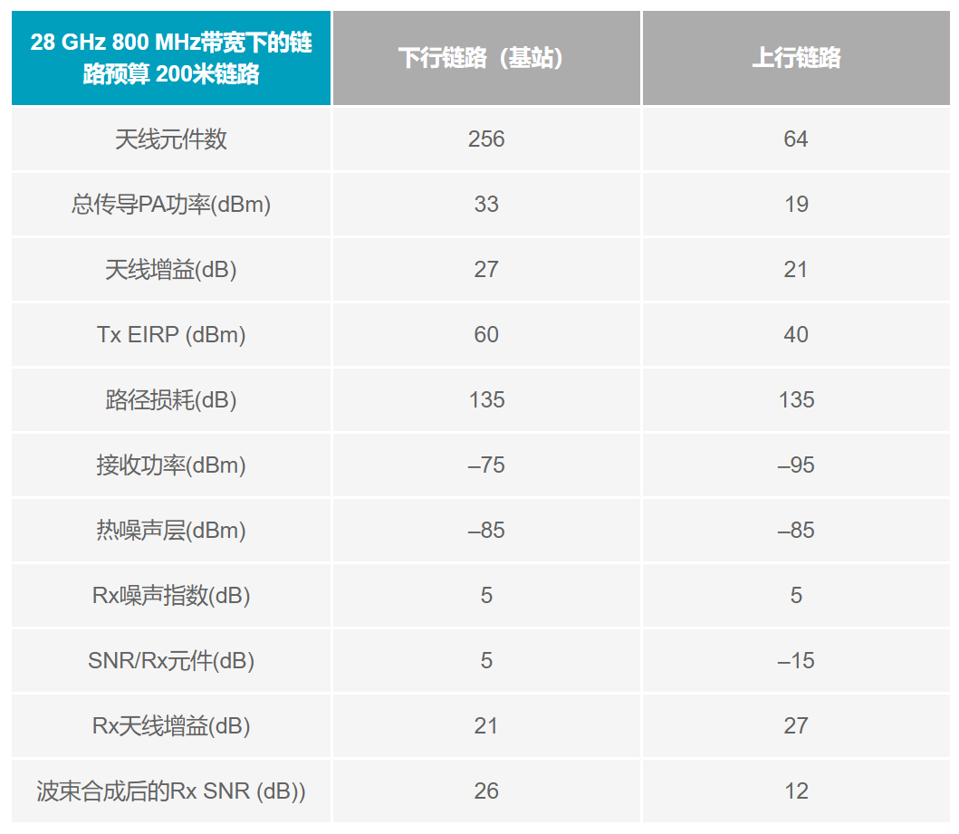 在这种情况下,我们假设基站中有256个元件,CPE中有64个元件。在这两种情况下,通过硅实施均可满足输出功率。假定链路是不对称的,这在上行链路预算中起到了一定的缓解作用。在这种情况下,平均链路质量应允许在下行链路中进行64 QAM操作,在上行链路中进行16 QAM操作。如果需要,可以增加CPE 的发射功率至法定区域限制,以便改善上行链路。如果将链路范围延伸到500米,路径损耗将增加到大约150 dB。这是可行的,但会使上行链路和下行链路上的无线电变得更加复杂,功耗也将急剧增加。