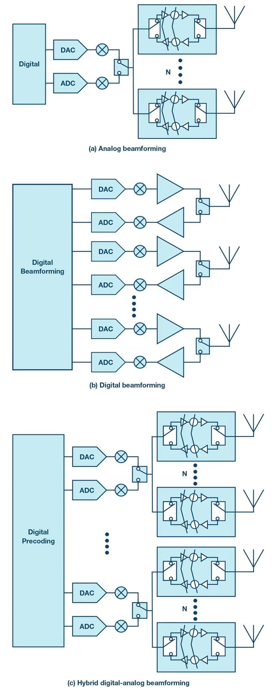 数字波束成型就是字面意思。相移完全在数字电路中实现,然后通过收发器阵列馈送到天线阵列。简单地说,每个无线电收发器都连接到一个天线元件,但实际上每个无线电都可以有多个天线元件,具体取决于所需扇区的形状。该数字方法可实现最大容量和灵活性,并支持毫米波频率的多用户MIMO发展规划,类似于中频系统。这非常复杂,考虑到目前可用的技术,无论是在射频还是数字电路中,都将消耗过多的直流电。然而,随着未来技术的发展,毫米波无线电将出现数字波束合成。