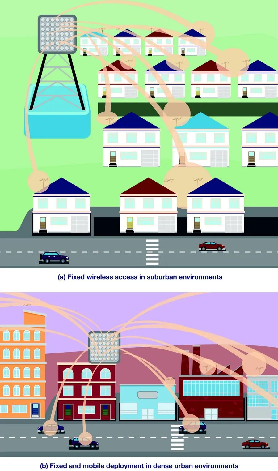图1演示了一个固定无线接入(FWA)用例,在此用例中,向郊区环境中的家庭提供高带宽数据。在这种情况下,基站位于电线杆或塔上,并需要覆盖大片区域才能产生积极的商业案例。在初始部署中,假设覆盖范围是室外到室外,是以客户终端设备(CPE)安装在户外,并且在设计链接时确保最佳无线连接。由于天线向下,而用户固定,可能不需要很大的垂直转向范围,但发射功率可能相当高,超过65 dBm EIRP,以最大限度地增加覆盖范围并利用现有的基础设施。