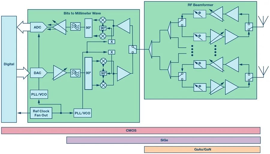 当我们从数字转向天线时,就已经为信号链绘制了潜在技术的进展图。当然,数字信号和混合信号都是在细线体CMOS工艺中产生的。根据基站的要求,整个信号链可以用CMOS开发,或者更有可能的是,采用多种技术的混合开发,为信号链提供最佳性能。例如,一种常见的配置是使用具有高性能SiGe BiCMOS IF 到毫米波转换的CMOS数据转换器。如图所示,波束成型可采用多种技术实现,具体取决于系统需求,我们将在下面讨论。根据所选的天线尺寸和发射功率要求,可以实现高度集成的硅方法,也可以是硅波束成型与离散PA和LNA的组合。