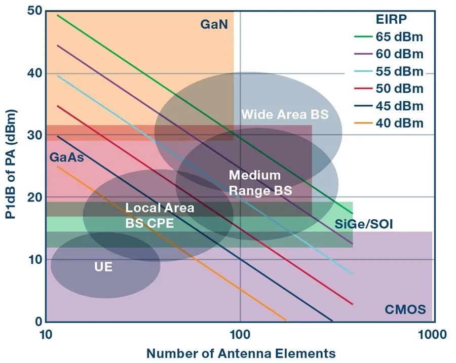 FCC按设备类别3,6 设定有定义和发布的规格,以及发射功率限制,这里我们遵循基站的3GPP术语。如图5所示,设备类别或多或少地限定了功率放大器的技术选择。虽然这不是一门精确的科学,但我们可以看到,移动用户设备(手机)非常适合CMOS技术,相对较低的天线数量可以达到所需的变送器功率。这种类型的无线电将需要高度集成和省电才能满足便携式设备的需求。本地基站(小型蜂窝)和消费者终端设备(可移动电源)要求类似,涉及从变送器功率要求低端的CMOS到更高端的SiGe BiCMOS的一系列技术。中程基站非常适合SiGe BiCMOS技术,可实现紧凑的外形尺寸。在高端,对于广域基站来说,可以应用各种技术,具体取决于对天线尺寸和技术成本的权衡。尽管可在60 dBm EIRP范围内应用SiGe BiCMOS,但GaAs或GaN功率放大器更适合更高的功率。