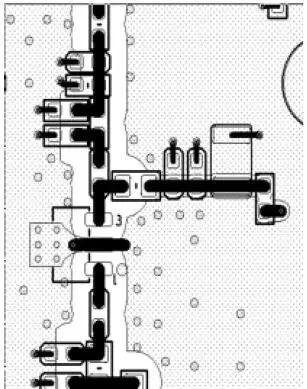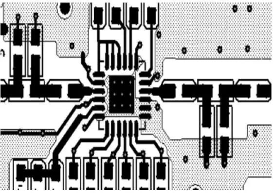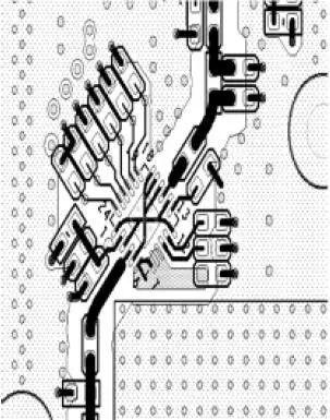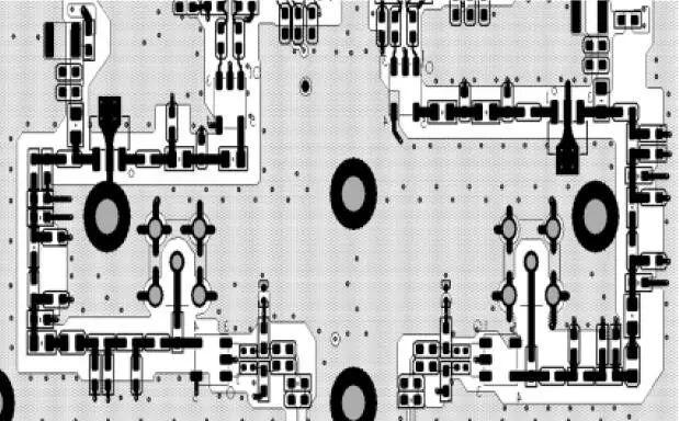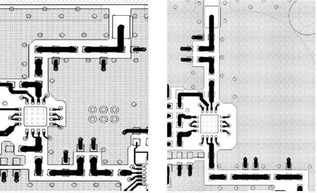 同层的射频线要作包地处理,并在地铜皮上加地过孔,孔间距应小于信号频率所对应波长(λ)的1/20,均匀排列整齐。包地铜皮边缘离射频线2W的宽度或3H的高度,H表示相邻介质层的总厚度。