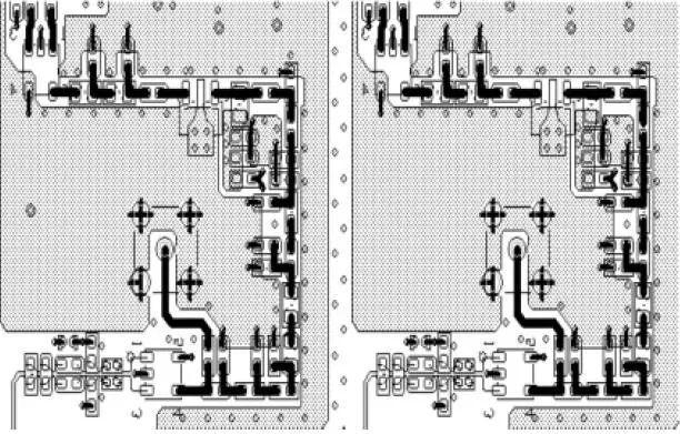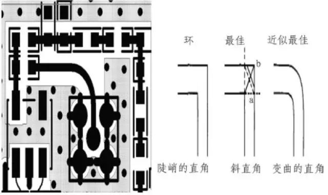 射频线不能直的情况下,作圆弧线处理,这样可以减少RF信号对外的辐射和相互问的耦合。有实验证明,传输线的拐角采用变曲的直角,能最大限度的降低回损。如图9所示。