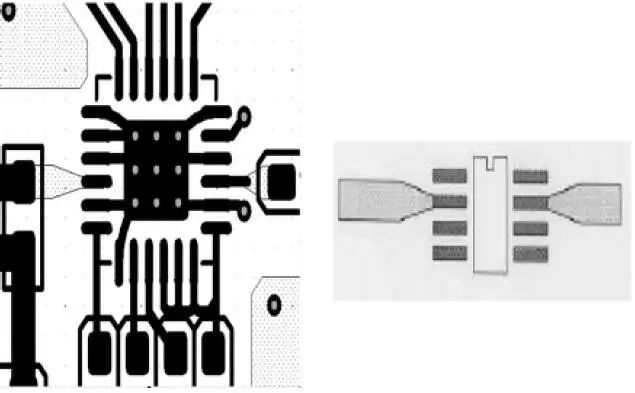 在射频线宽比IC器件管脚的宽度大比较多的情况下,接触芯片的线宽采用渐变方式,如图8所示。