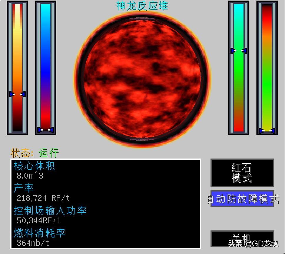 往后部分可依据实际情况而调整,因1.12版本反应堆特性导致神龙反应堆随着燃料燃烧进度而在“初始输出功率”的情况下缓慢增加反应堆温度,建议燃料燃烧至75%-85%左右时关闭反应堆更换燃料,若燃料燃烧进度超过85%则无法关机,原因是此特性导致温度缓慢上升,燃料燃烧进度约为85%时会因堆温过高而失控爆炸)。这样下去,控制场不需要调整,但是输出功率一直被调节增长,这样就有了“初始输出功率”的概念。
