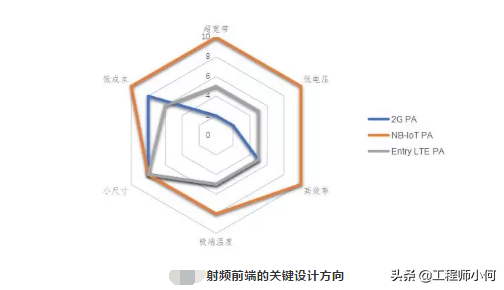 从上面我们可以看出,NB-IoT虽然有要求和LTE相同的上行功率(power class3),但是信号的峰均比较低。另外,NB-IoT采用半双工方式工作,避免使用FDD双工器,PA后端的插入损耗小。 这些因素可以让NB-IoT的PA更加偏向于非线性的设计,同时采用更小的Die设计,从而达到节省成本和提高效率的目的。