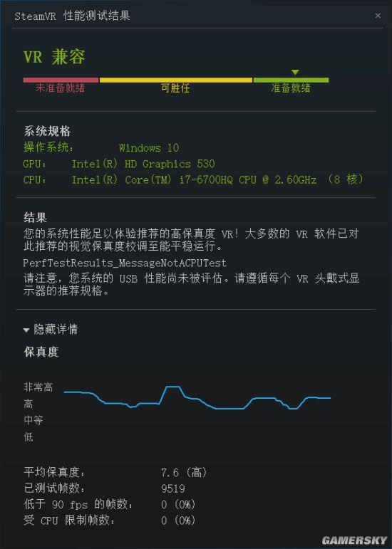 当然了,使用现有的VR虚拟现实测试素材来考察一下微星GP62MVR 6RF(Leopard Pro)-215CN游戏本在VR应用中的表现,还是相当有必要的。下面,我们就来看一看这款游戏本在由STEAM提供的免费VR性能评估软件——SteamVR性能测试中的得分与评价,测试结果如下: