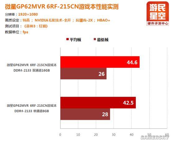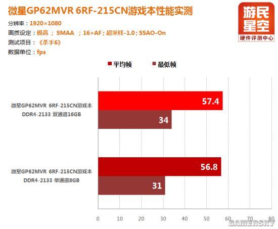 而导致这种情况出现的原因,则是因为微星GP62MVR 6RF(Leopard Pro)-215CN游戏本配备的单通道8GB内存,在性能上相对采用双通道内存的GT72VR 6RD(Dominator)-059CN要逊色一点点,如果各位将升级完内存,组好双通道,在双通道内存的加持下,两者的之间的性能差距将会缩小许多。当然了,由于微星GP62MVR 6RF(Leopard Pro)-215CN本标配的单条8GB内存已经够用,所以反映在实际游戏测试中,却并没有那么显著。