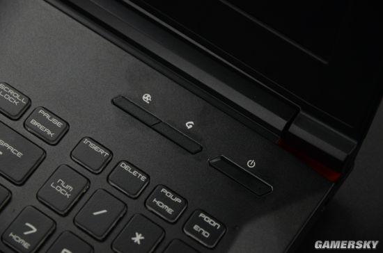 至于功能键配置上,我们可以在微星GP62MVR 6RF(Leopard Pro)-215CN游戏本的开关按钮左侧,看到一个用来调节赛睿背光游戏键盘灯光的按钮以及“强冷模式”的启动/停止按钮。