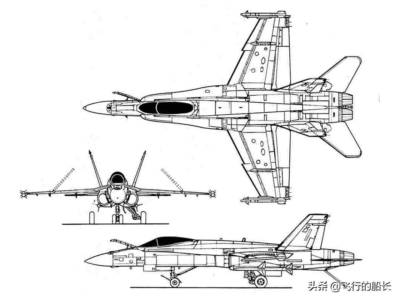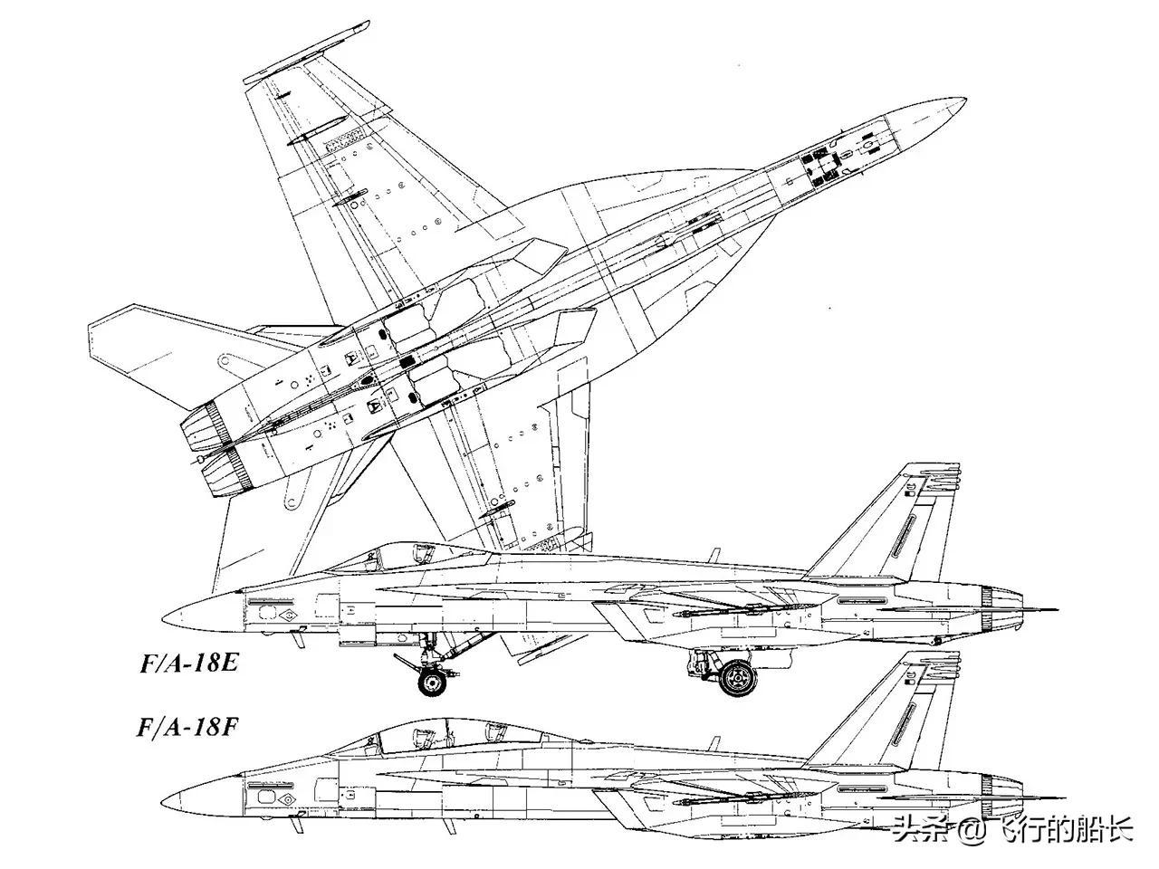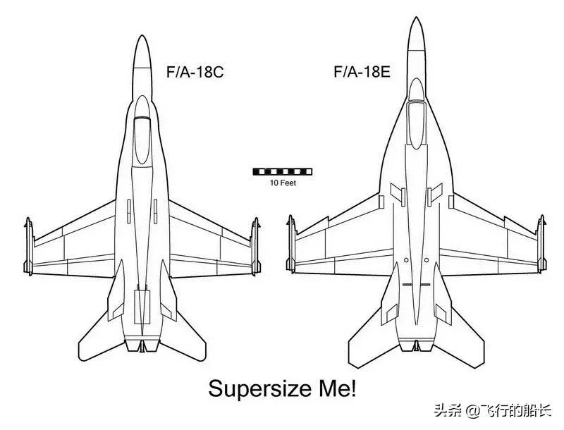 F/A-18E与F/A-18C的投影对比,机体尺寸,机翼前缘,边条翼形状等均有不同