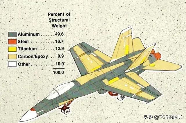 F/A-18是第一种大范围使用复合材料的战斗机,机身、机翼等结构约40%的表面采用了石墨/环氧树脂复合材料蒙皮,占结构重量的比例达到9.9%。