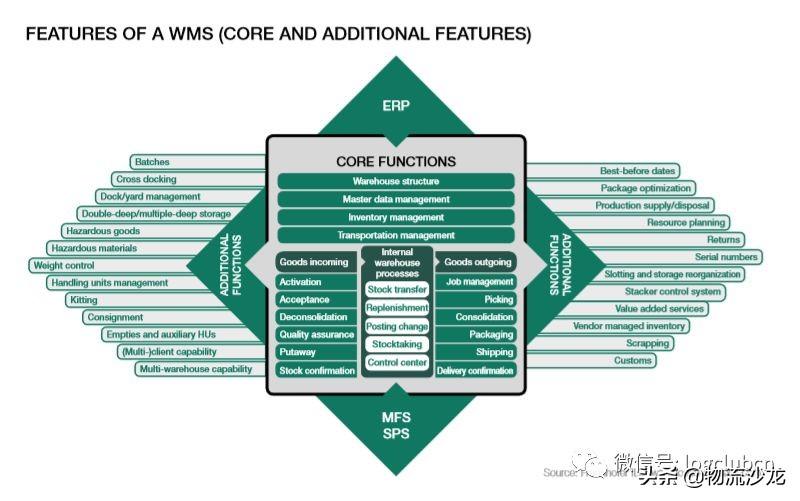 未来的WMS解决方案需要为您的公司提供哪些功能 - 标准功能是否足以满足您的仓库结构和管理您的主数据,库存和运输?或者您(还)是否需要其他功能,例如处理危险品或移动设备的控制中心?在此处了解选择未来WMS系统时应考虑的标准。下图为您提供了WMS功能的概述(核心和附加功能)。