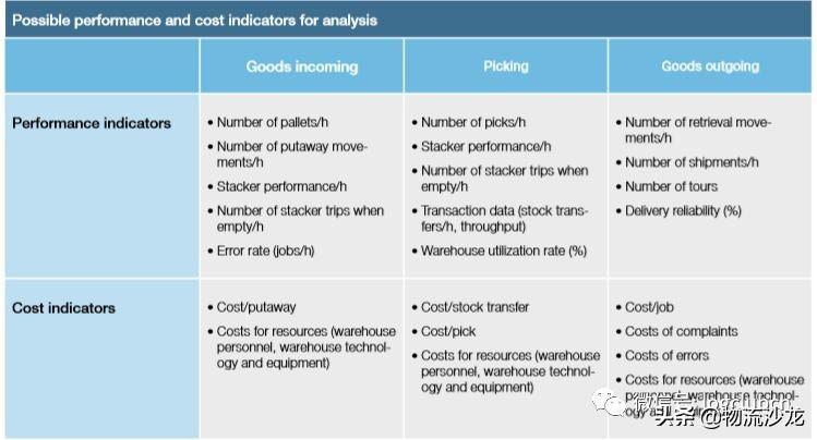 分析仓库中的增值流程,评估低效流程及其对成本的影响通过现代化仓库(例如,拣选,物料流控制和运输管理),可以使哪些区域和流程更高效?各部门之间的工作流程和智能联网有多好(例如货物进货和运输)?您和您的项目团队对新仓库管理软件有什么期望(例如,云连接,处理技术的连接)?下表列出了从拣货 和提供货物的性能 和成本指标 。这将向您展示仓库管理系统可以实现的目标。