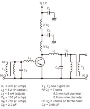 图33显示使用2N5642 RF功率晶体管放大器的示意图。匹配必须以在 175 MHz 频点,窄带实现。