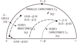 图35显示了用于输入匹配电路图形设计的图表。在这种情况下,电路 Q 必须大于约 5,并且已选择等于 10。在Q=5时,C1将是无限的。添加 C1 的有限值会增加电路 Q,从而增加选择性。图括号内的归一化值是导纳(g+jb)。