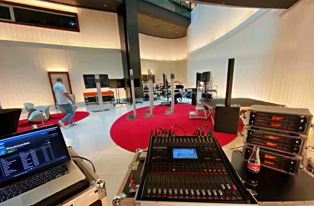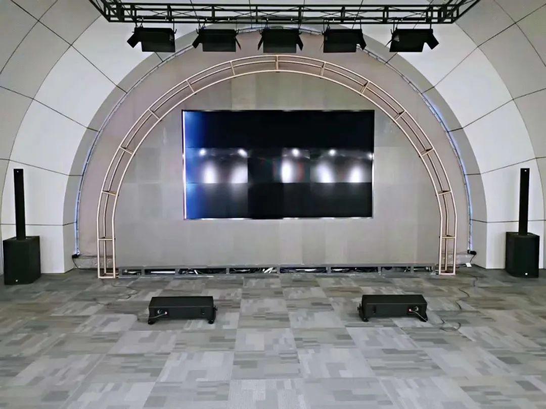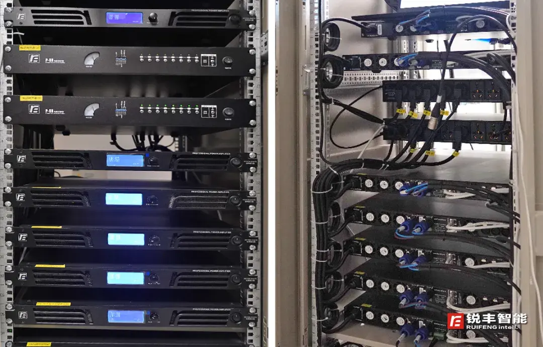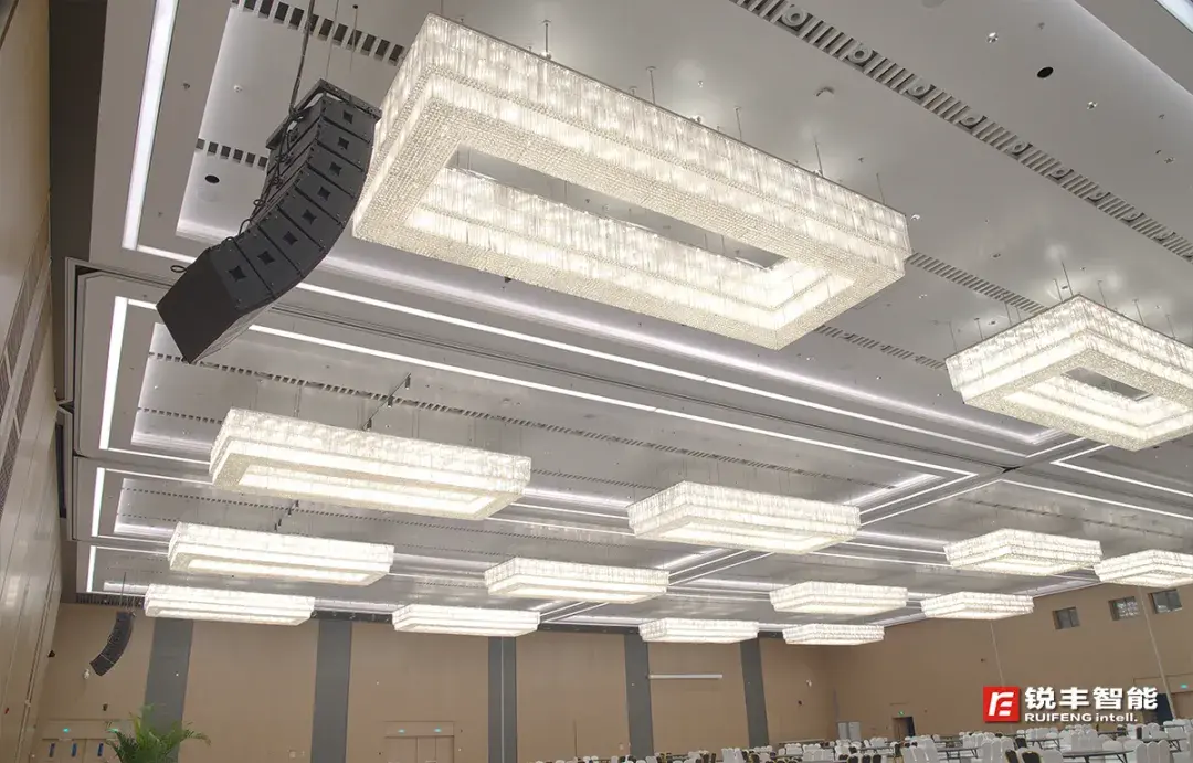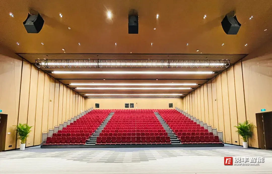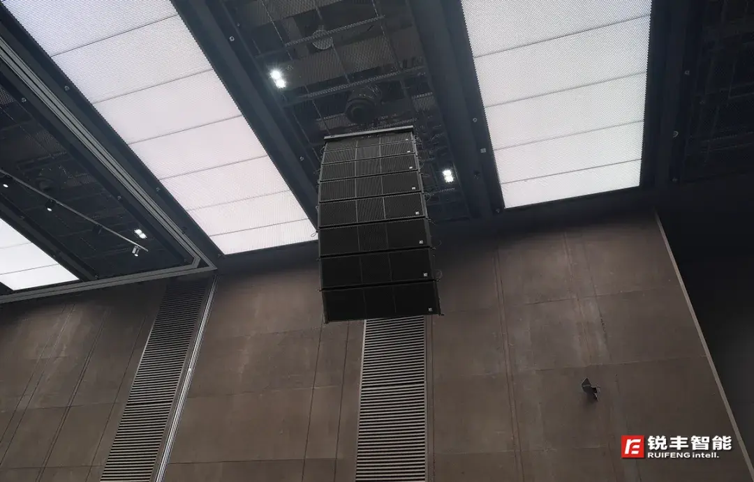 为了打造出适应多模式多变化的新型数字化扩声系统,锐丰智能的工程师在设计时充分考虑到:信号传输的安全、高效、兼容性等特点,核心控制处理设备采用了集DSP数字信号处理、Dante数字信号(主备)+模拟信号自动切换热备份、网络监控等功能于一体的"RF"DA系列Dante数字功放;同时,要求声音具有良好的均匀覆盖和整个频宽范围内一致性非常好的清晰度及良好的声像定位,扩声音箱采用了"RF"GTS系列线阵列音箱和MQ系列天花喇叭。