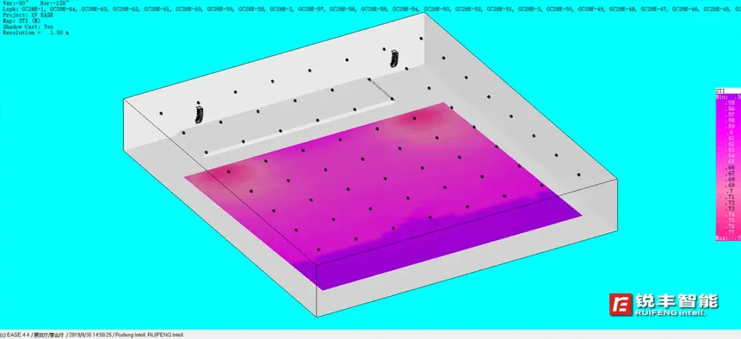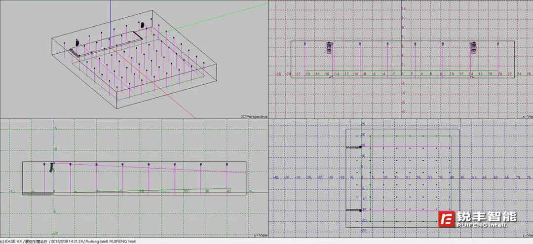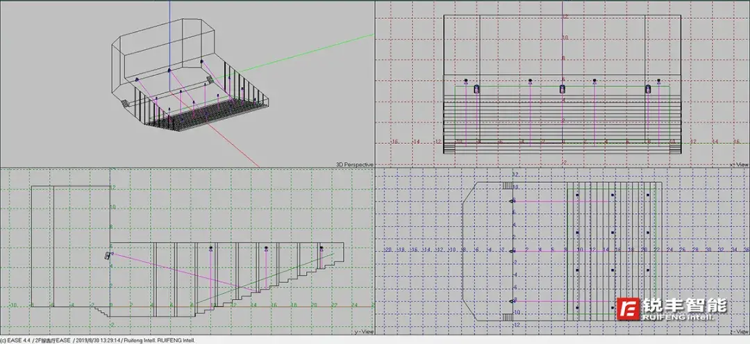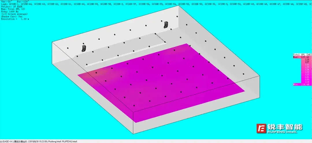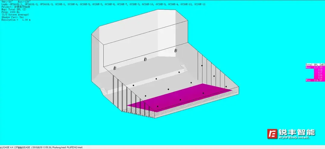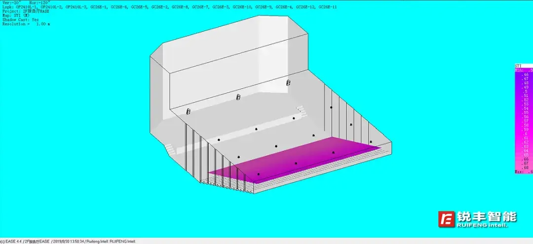 锐丰智能的工程师在进行方案设计时,根据甲方提供的图纸和资料建立了供EASE使用的建筑3D模型,通过计算机对该报告厅进行了EASE声学模拟运算,数据显示:各频段最大声压级、声场不均匀度等各项指标能满足一级标准的要求,并有较大的动态余量。