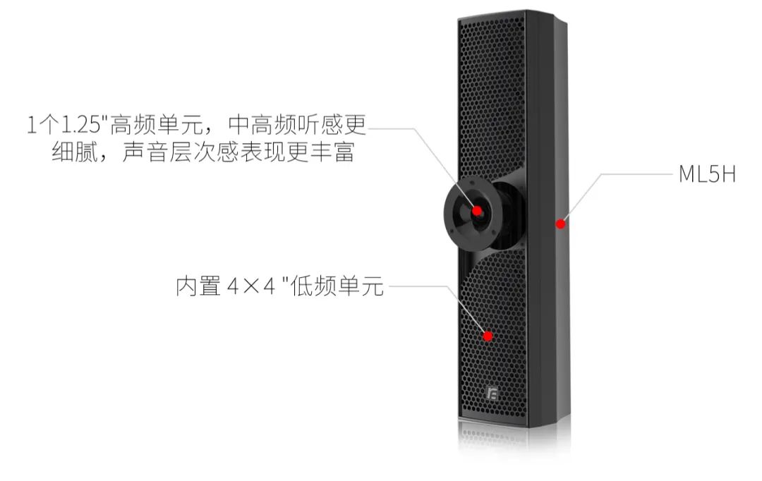 ML5H内置4×4寸中低音单元和1个1.25寸高音单元,子弹头式高音相位塞搭配80×40指向小号角扩散设计。紧凑型小箱体具备高声压级输出,高保真扩声性能,并且可以多只组成垂直阵列,拥有安装方便快捷的特性。
