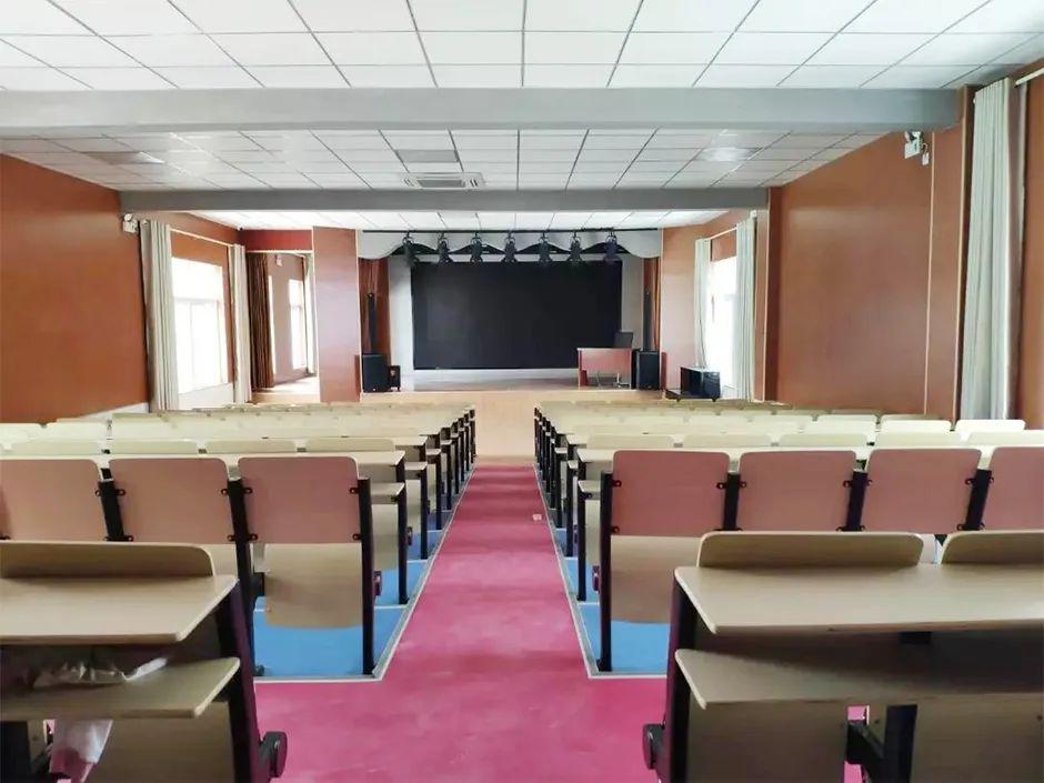 越秀会议中心的报告厅设有500个自动可折叠式阶梯座椅,配备电动升降吊点和一流的音响设备,座椅收起后,可作为616平方米中型会议厅,适合各类研讨会、试映会、文艺演出等。左中右主扩声音箱采用了3组OP2410L 多单元强声矩阵音箱,其它功能音箱采用流动安装的方式。