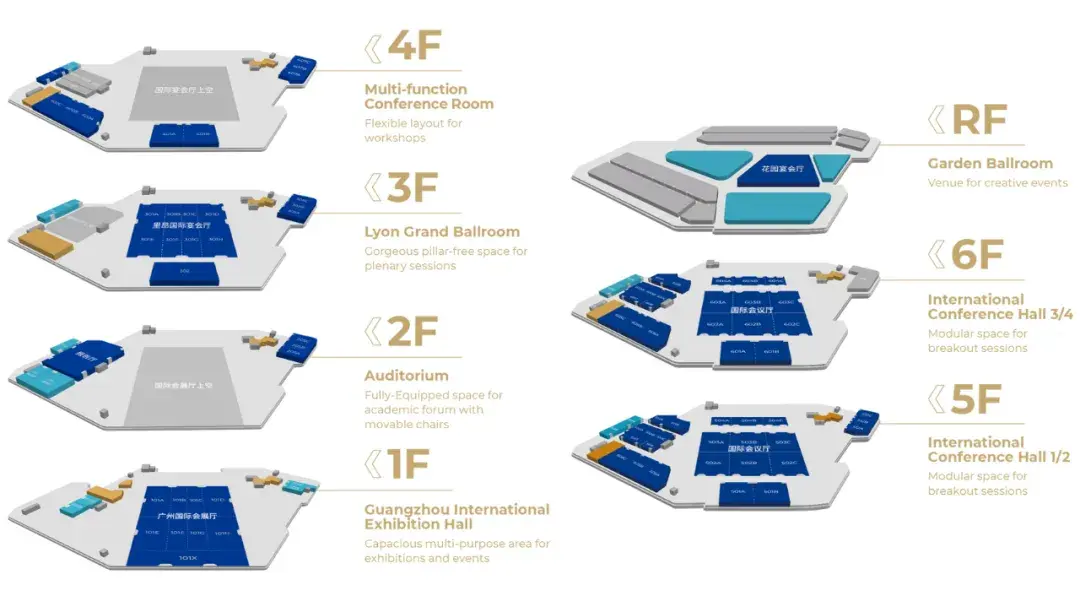 各个多功能会议厅、宴会厅分布于会议中心的二至六层,面积从30至210平方米不等,大部分采用落地玻璃窗设计,自然采光。可灵活分隔或组合使用,隔音系数达52分贝,适合用作分会场或举行中小型会议/宴会,其扩声系统均采用了"RF"MQ-8C天花喇叭。