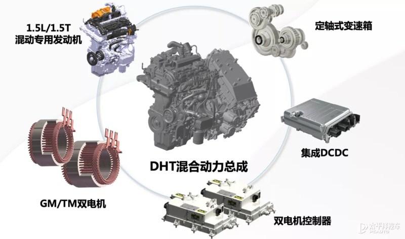 其中1.5T 混动专用发动机可输出最大功率115kW,峰值扭矩为235N·m。该发动机采用了缸盖集成排气歧管、350bar顶置直喷、耐高温VGT增压器、深度米勒循环等技术,热效率达到了38%,与比亚迪的43.04%、吉利的43.32%相比,还存在着一定的差距。