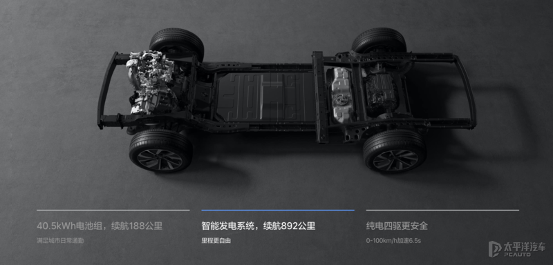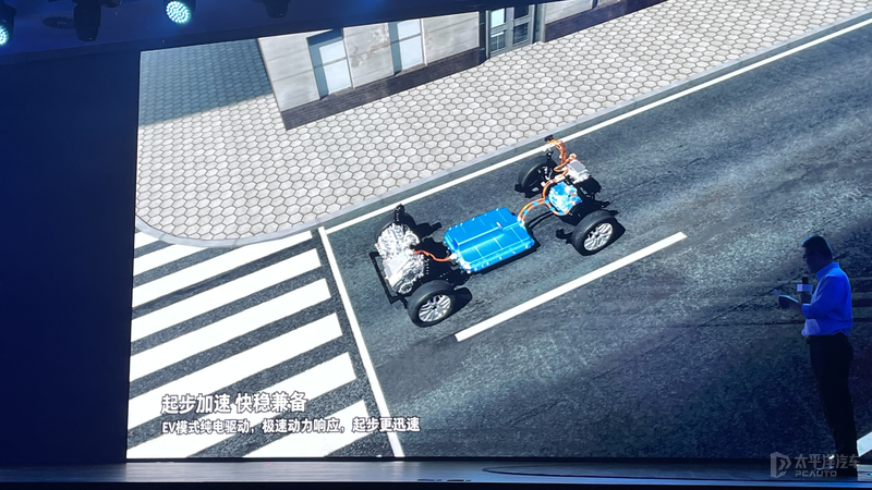 在混动模式中,车辆起步和低速行驶时同样采用纯电驱动,通过离合器将发动机与传动系统的解耦,TM电机通过两级齿轮将动力传递到车轮;在电池电量不足,且车辆运行在较低的车速时,此时无论轻柔行驶还是急加速,系统都以串联模式(增程)工作,发动机始终处于最高效的运行区间,从而带动发电机发电,发出来的电一部分带动驱动电机,剩下的电则给电池充电。
