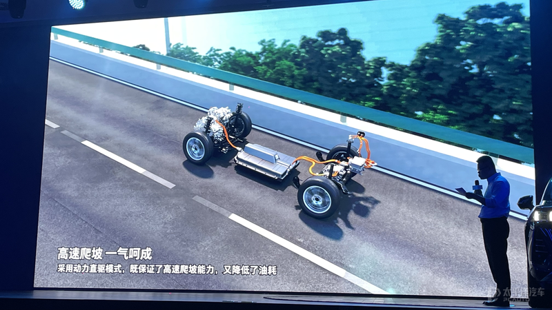 在高速行车中需要急加速超车时,系统将会以全动力进行输出,提供最佳的动力及最高的动力响应。此外,车辆在减速或者下坡状态时,离合器断开,通过TM电机的反拖进行动能回收,该车还支持智能单踏板驾驶,以实现最大程度的能量回收。