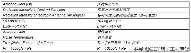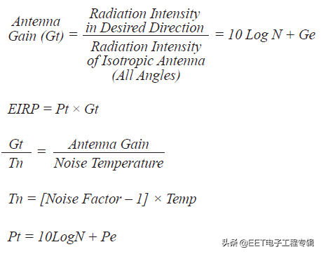 在设计时要考虑阵列大小与每个辐射元件的功率之间的权衡关系,这些元件会影响波束的方向性和有效辐射功率。可以通过考察一些常见的品质因数来预测天线的性能。通常,天线设计人员会考察天线增益、有效各向辐射功率(EIRP)及Gt/Tn。有一些基础等式可用于描述以下等式中所示的这些参数。我们可以看到,天线增益和EIRP与阵列中元件的数量成正比。这可能导致地面雷达应用中常见的大型阵列。