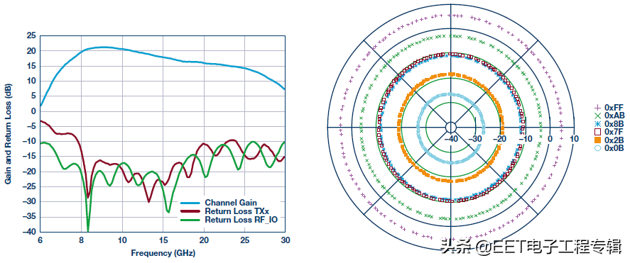 ADI公司开发了集成模拟波束成形IC,其可以支持雷达、卫星通信、5G通信等一系列应用。ADAR1000 X-/Ku波段波束成形IC是一款4通道器件,覆盖频段为8 GHz至16 GHz,工作于时分双工(TDD)模式,其发射器和接收器集成在一个IC当中。该器件是X波段雷达应用以及Ku波段卫星通信的理想选择,在这类应用中,IC可以配置为仅以收发器模式或仅接收器模式运行。这款4通道IC采用7 mm×7 mm QFN表贴封装,可轻松集成到平板阵列当中,在发射模式下功耗仅为240 mW/通道,在接收模式下功耗仅为160 mW/通道。收发器和接收器通道直接可用,在外部设计上可以与ADI公司提供的前端模块(FEM)配合使用。图5显示了具有全360°相位覆盖的增益和相位控制,可以实现小于2.8°的相位步长和优于31 dB的增益控制。ADAR1000集成片上存储器,可存储多达121个波束状态,其中一个状态包含整个IC的所有相位和增益设置。发射器提供大约19 dB的增益和15 dBm的饱和功率,其中接收增益约为14 dB。另一个关键指标是增益控制的相位变化,其在20 dB范围内约为3°。同样,在整个360°相位覆盖范围内,相位控制的增益变化约为0.25 dB,缓解了校准难题。