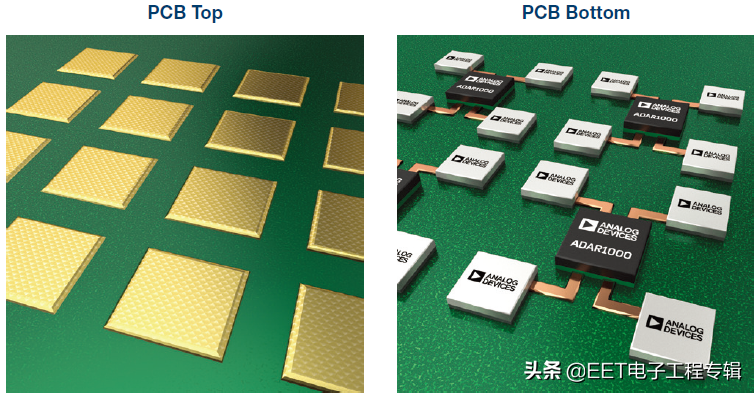 我们构建整个天线时,阵列设计面临许多挑战,包括控制线路由、电源管理、脉冲电路、散热管理、环境考虑因素等。业界有一股庞大的推动力量,促使我们走向体积小、重量轻的低剖面阵列。传统的电路板结构使用小型PCB板,其上的电子元件垂直馈入天线PCB的背面。在过去的20年中,这种方法不断改进,以持续减小电路板的尺寸,从而减小天线的深度。下一代设计从这种板结构转向平板式方法,其中,每个IC都有足够高的集成度,可以简单地安装在天线板的背面,大大减小了天线的深度,使它们能更容易地装入便携应用或机载应用当中。在图3中,左图展示了PCB顶部的金色贴片天线元件,右图显示了PCB底部的天线模拟前端。这只是天线的一个子集,其中,天线一端可能发生频率转换级;同时也是一个分配网络,负责从单个RF输入开始路由到整个阵列。显然,集成度更高的IC显著减少了天线设计中的挑战,并且随着天线变得越来越小,越来越多的电子元件被集成到越来越小的空间中,天线设计需要新的半导体技术来帮助提高解决方案的可行性。