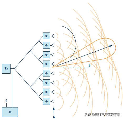 相控阵天线是组装在一起的天线元件的集合,其中,每个元件的辐射图均在结构上与相邻天线的辐射图组合形成称为主瓣的有效辐射图。主瓣在期望位置发射辐射能量,而根据设计,天线负责破坏性地干扰无用方向上的信号,形成无效信号和旁瓣。天线阵列设计用于最大化主瓣辐射的能量,同时将旁瓣辐射的能量降低到可接受的水平。可以通过改变馈入每个天线元件的信号的相位来操纵辐射方向。图1展示了如何通过调整每个天线中信号的相位,将有效波束控制在线性阵列的目标方向上。结果,阵列中的每个天线都具有独立的相位和幅度设置,以形成期望的辐射图。由于没有机械运动部件,所以很容易理解相控阵中波束快速转向的属性。基于IC的半导体相位调整可以在几纳秒内完成,这样我们就可以改变辐射图的方向,针对新的威胁或用户快速做出响应。类似地,我们可以从辐射波束变为有效零点以吸收干扰物的信号,使该物体看起来不可见,隐形飞机即是如此。重新定位辐射图或改变为有效零点,这些变化几乎可以立即完成,因为我们可以使用基于IC的器件而非机械部件,以电气方式改变相位设置。相控阵天线相比机械天线的另一个优势是它能同时辐射多个波束,因而可以跟踪多个目标或管理多个数据流的用户数据。这是通过在基带频率下对多个数据流进行数字信号处理来实现的。