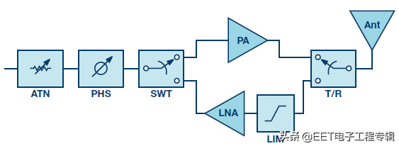 标准脉冲雷达系统发射可以从物体上反射的信号,雷达等待返回脉冲以映射天线的视场。在过去几年中,这种天线前端解决方案会采用分立式元件,此类元件很可能采用砷化镓技术。用作这些相控阵天线构建模块的IC元件如图4所示。它们包括一个用于调整每个天线元件相位(最终控制天线)的移相器、一个可以使波束逐渐变细的衰减器、一个用于传输信号的功率放大器和一个用于接收信号的低噪声放大器,另有一个用于在发射与接收之间切换的开关。在过去的实施方案中,这些IC中的每一个都可能放在5mm×5mm的封装中,更先进的解决方案则可能用集成式单片单通道GaAs IC来实现该功能。