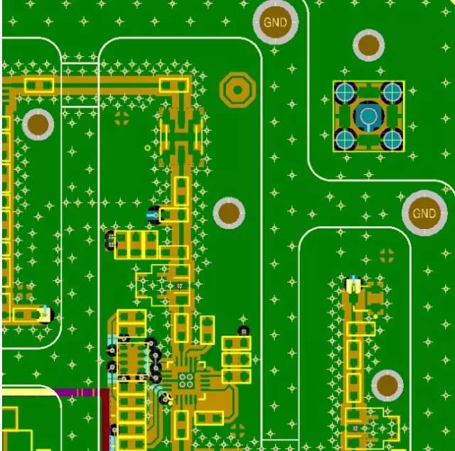 其次,在面积较大的地平面处,我们通常会放置很多的过孔用于连接不同层的地。这在射频电路的布线中,要注意的就是大过孔要没有规律的打,最好能弄成菱形的,这样可以最大限度的抑制各种干扰。