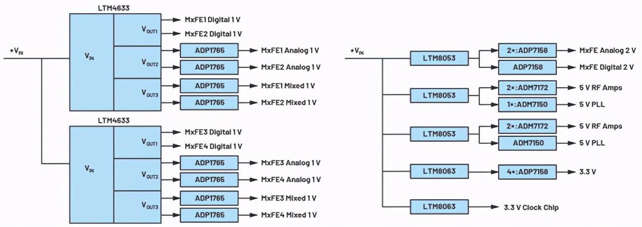 功率分配和稳压如图4所示。所需的所有电压都源自单个12 V输入。功率分配设计包含开关稳压器组合,其后增加低噪声线性稳压器,用于提供对噪声敏感的模拟电压。