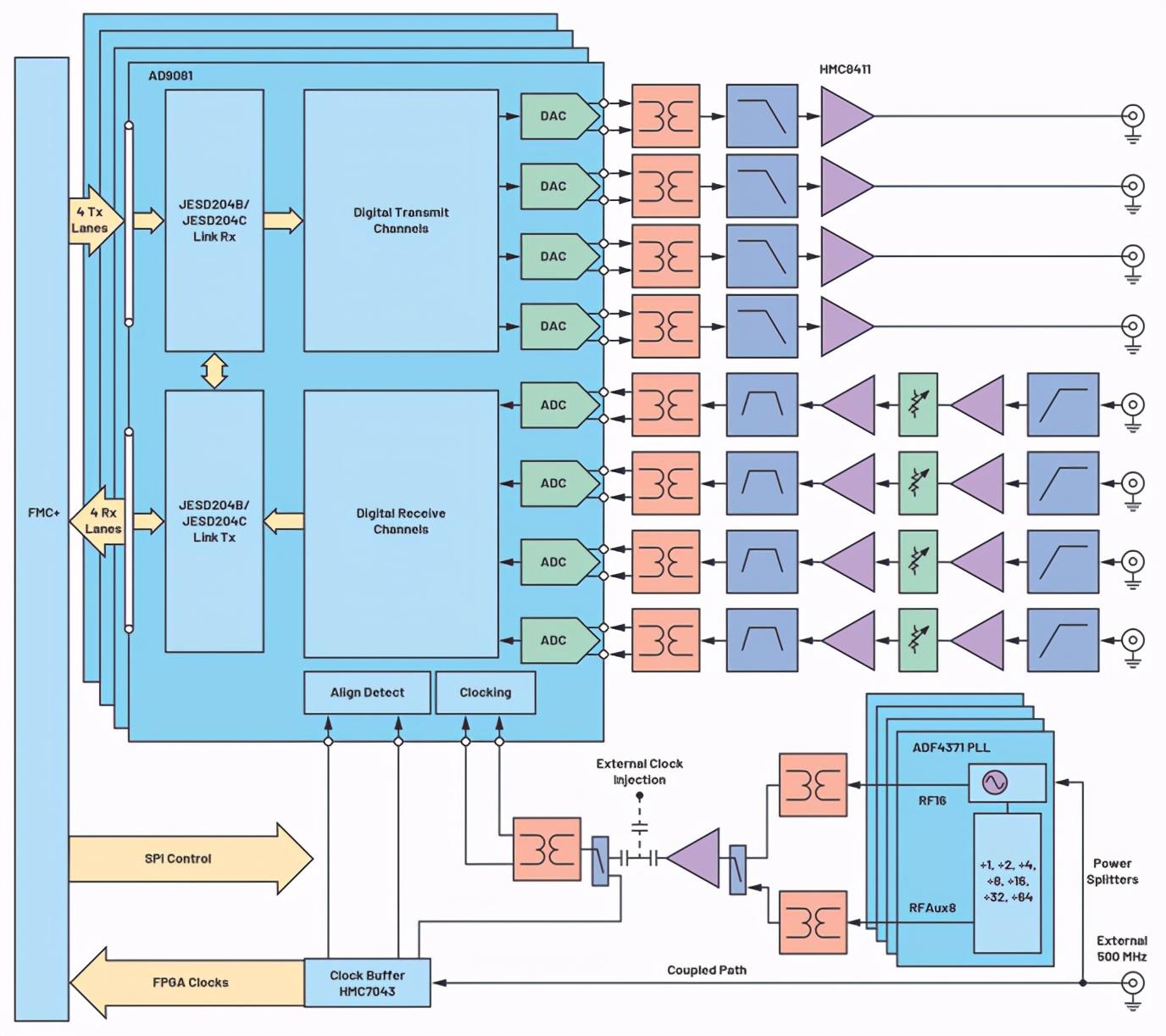 ADI公司推出的这款16通道、直接RF采样开发平台如图2所示,其框图如图3所示。为了说明其命名约定:我们将集成式转换器命名为混合信号前端(MxFE),将包含4个MxFE的16通道板命名为四MxFE。4个MxFE每个包含4个DAC和4个ADC,所以共有16个发射通道和16个接收通道。