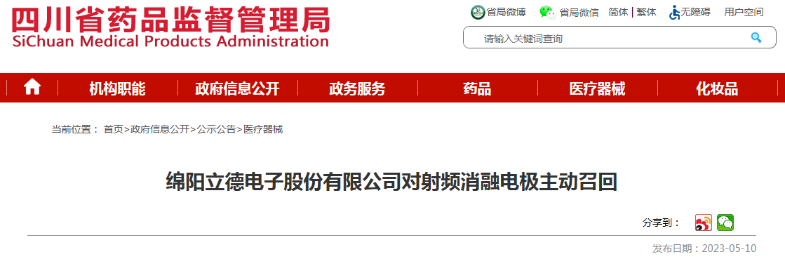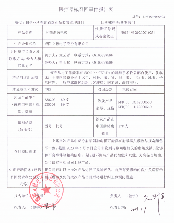 绵阳立德电子股份有限公司对射频消融电极主动召回