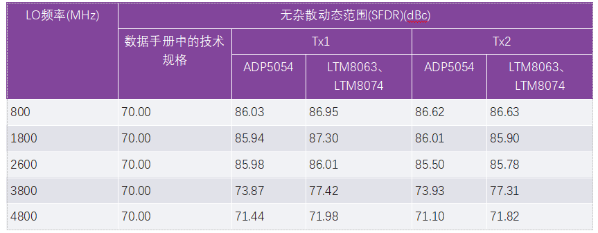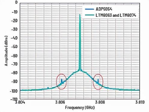 采用两种电源解决方案的收发器的SFDR测量结果如表3所示,两种方案的性能相当,除了LO = 3800 MHz,这种情况下ADP5054的开关纹波开始在载波信号输出频谱上产生调制杂散,如图9所示。