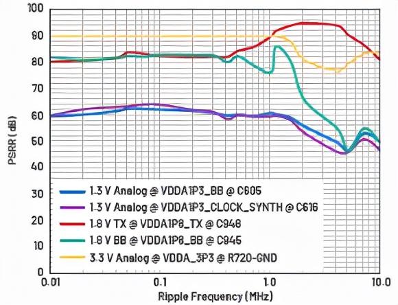 与PSMR结果类似,PSRR数据表明,耦合到本振频率(特别是高于1 MHz)的大部分噪声来自VDDA1P3_AN和VDDA_3P3电源轨。